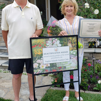 Our very own Lynn Shober and hubby Martin are the grateful recipients of the Spring Beautification Award. Symmetry and color are the hallmarks of their beautiful gardens. Situated on a slight curve, Lynn and Martin’s home is bordered with raised brick planters and lush, natural grass. Airy trees frame the residence. White and red rose bushes provide year round blooms and fragrance, while cinerarias and delphiniums add pops of vibrant shades of purple in spring and early summer. Martin invited the award team to visit the Shober back patio that is both an entertaining space and private retreat. Being in Naples means being creative in smaller spaces (compared to their multi-acre property in Rolling Hills Estates). Trees in the ground and pots, espaliered vines, ferns, fuchsias, herbs and succulents compliment every section of the flag stone patio patio. Take your next stroll by 5645 Campo Walk and become inspired!